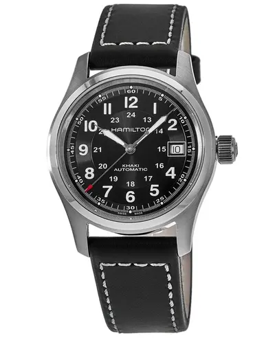 Stainless steel case, black leather strap with tang clasp. Fixed bezel. Black dial featuring automatic self-winding movement and push-in crown. Equipped with scratch-resistant sapphire crystal. Case size 38mm, thickness 11mm. Transparent case back included. Water resistant to 100 meters (330 feet). Comes with a standard 2 year WatchMaxx warranty.