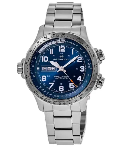 A brand new authentic Hamilton Men's Khaki X-Wind Day Date watch with automatic movement powered by the Caliber H-30 engine. Features a blue dial, stainless steel case and bracelet made from 316L, deployment clasp, rotating bezel (unidirectional), sapphire crystal with scratch resistance, round shape measuring 45mm in diameter, silver tone hour and minute hands, Arabic numeral hour markers including outer minute track, date function at the 6 o'clock position, second hand visible through a cycloidal tourbillon aperture. Water resistant up to 50 meters (165 feet) depth. Comes with a 2-year WatchMaxx warranty.