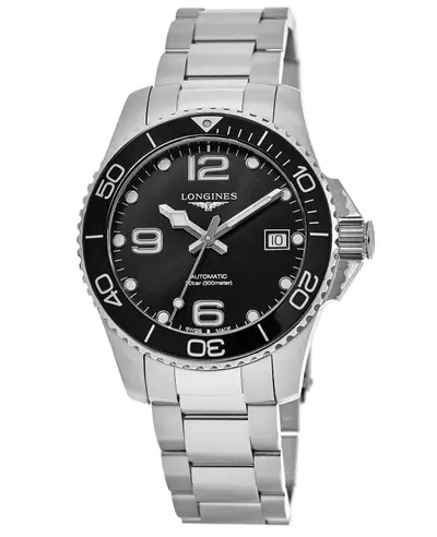 A new authentic Longines HydroConquest automatic watch model L3.780.4.56.6, also known as L37804566. Features a stainless steel and ceramic case with a stainless steel bracelet equipped with deployment clasp featuring push button activation and fold-over mechanism. The unidirectional rotating bezel is included. Displayed on the black dial are silver tone hands, Arabic numeral/dot hour markers, minute markers along the outer rim, and date functionality at the 3 o'clock position. Powered by Longines Caliber L888 automatic movement with a 72-hour power reserve. Standard functions include hours, minutes, seconds, and date display. The crown is screw-in style. Protected by scratch-resistant sapphire crystal glass. The round case measures 39mm in diameter and has a thickness of 12.20mm with a solid case back. It offers professional water resistance rated at 300 meters or approximately 990 feet depth, backed by a 5-year WatchMaxx warranty.