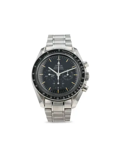 A pre-owned Omega Speedmaster from 1990, Ref. 25225614. Features a black round index dial with baton hands and a rotating bezel. Stainless steel case, screw-down crown, stainless steel link bracelet (with star acorns), sapphire crystal glass, mechanical chronograph movement including minute, hour, second subdials/stopwatch counters, folding clasp. No original box or papers included. Comes with standard one-year warranty from the boutique. Condition: Excellent - near perfect state, no signs of damage or excessive use.