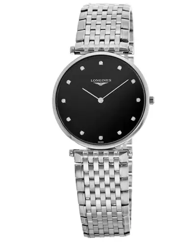 Authentic Brand New Longines watch model L4.755.4.58.6. The La Grande Classique collection features this quartz movement timepiece with a black diamond dial and stainless steel case paired with a matching unisex stainless steel bracelet equipped with a folding clasp and fixed bezel. This elegant wristwatch is powered by a battery-operated quartz mechanism, protected by scratch-resistant sapphire crystal glass, and boasts an automatic date function. The 36mm solid steel case houses the movement securely within its design. It comes standard with water resistance up to 100 feet or 30 meters depth suitable for everyday wear near water sources like swimming pools but not recommended for diving activities. The watch is backed by a comprehensive 2 year WatchMaxx warranty ensuring long-term reliability and quality assurance.