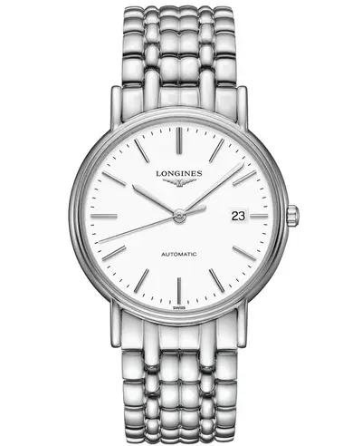 Brand New Authentic Longines Presence Automatic watch model L4.922.4.12.6, round stainless steel case with fixed bezel and hidden deployment clasp; white dial featuring silver hour markers and hands; sapphire crystal scratch resistant glass; automatic self-winding movement with 64-hour power reserve displaying date, hours, minutes, seconds; water resistant to 30 meters (approx. 100 feet); comes with a stainless steel strap and includes a 2-year WatchMaxx warranty.