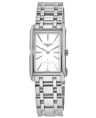 An authentic Longines DolceVita White Dial Stainless Steel Women's Watch model L5.512.4.11.6 features a rectangle stainless steel case, 37mm x 23.3mm in size, with fixed bezel and solid back. It comes equipped with a deployment bracelet that includes push button and foldover clasp functions. The White dial displays silver tone hands and Index hour markers along with a small seconds sub-dial for the chronograph function (operated by the Caliber L176). Powered by quartz movement, this watch offers hour, minute, second timekeeping capabilities. Essential features include scratch-resistant sapphire crystal, water resistance up to 30 meters / 100 feet, and includes a known model reference of L55124116.