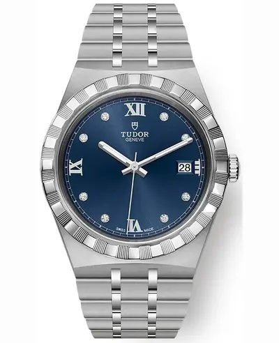 Authentic Tudor Royal Date watch with model number M28500-0006. Features a stunning blue dial accented by diamond hour markers and Roman numeral indices, along with minute markers around the outer rim. Silver-tone hands enhance readability. The case is crafted from durable stainless steel in a classic round shape measuring 38mm across the face. Equipped with a fluted bezel, screw-down crown, and scratch-resistant sapphire crystal lens for excellent visibility and protection.