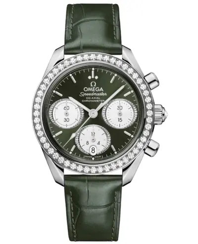 Luminous Silver Tone Hands and Stick Hour Markers; Minute Markers Around Outer Rim; Three Diamond Set Sub-dials displaying Date/30-Minute/Seconds/12 Hours; Date Feature at 6 o'clock position. Brushed and Polished Stainless Steel Case with Solid Case Back and Unique Shape, measuring 38mm diameter by 14.7mm thickness. Fixed Diamond Set Bezel accented by a Green Dial. Includes Unisex Automatic Chronograph Movement (Omega 3330 Engine) featuring Chronometer Accuracy and a 52-hour power reserve via the Omega 324.C automatic movement. Push-Pull Folding Clasp Closure, Scratch Resistant Sapphire Crystal. Rated at 100 meters / 330 feet water resistance with a standard 5-year WatchMaxx warranty against manufacturing defects.