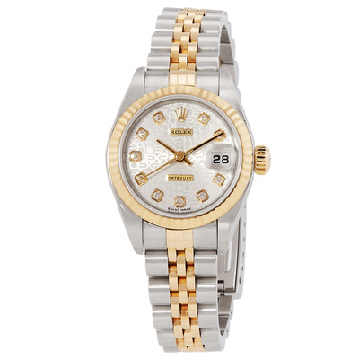 Silver-tone stainless steel case with a two-tone (silver-tone and gold-tone) 18kt yellow gold and stainless steel jubilee bracelet. Fluted fixed gold-tone 18kt yellow gold bezel. Ivory dial with gold-tone hands and Arabic numeral hour markers. Minute markers around the outer rim. Dial Type: Analog. Luminescent hands. Date display at the 3 o'clock position. Rolex Calibre 2235 Automatic movement, containing 31 Jewels, bitting at 28800 vph, and has a power reserve of approximately 48 hours. Scratch resistant sapphire crystal. Screw down crown. Solid case back. Round case shape, case size: 26 mm. Band length: 7 inches. Fold over clasp. Water resistant at 100 meters / 330 feet. Functions: date, hour, minute, second, chronometer. Datejust Series. Luxury watch style. Watch label: Swiss Made. Pre-owned Rolex Datejust Automatic Chronometer Ladies Watch 79173IJAJ.