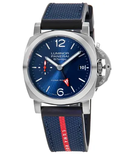 Brushed stainless steel case, automatic movement powered by Calibre P.900, blue dial with luminous silver tone hands and stick/arabic numeral hour markers including minute markers around the outer rim plus one sub-dial displaying small seconds also showing date at 3 o'clock position where date function is located includes power reserve of 72 hours a transparent sapphire crystal glass scratch resistant cushion shaped case equipped with titanium tang clasp protected bezel crown and water resistance up to 100 meters