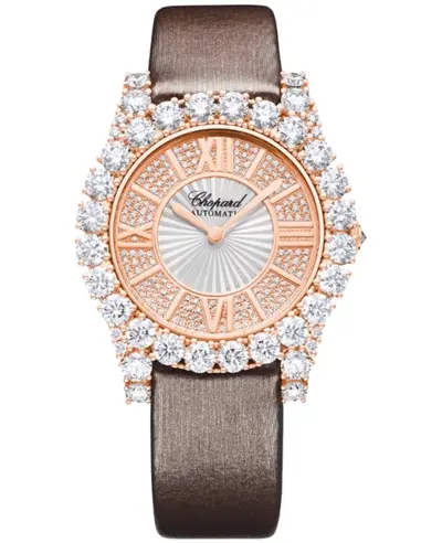 Authentic Chopard women's luxury watch model 139419-5601. Features polished 18K rose gold case, brown satin strap with diamond set buckle and tang clasp. Silver dial adorned with polished rose gold hands and stick/roman numeral hour markers. Powered by Swiss mechanical automatic movement with a 42-hour power reserve. Includes push-pull crown, scratch-resistant sapphire crystal, unique round medium case shape (35.75mm diameter), transparent case back, 30 meters water resistance, and a 2-year WatchMaxx warranty.