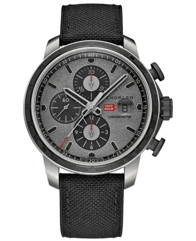 Titanium case with polished and brushed finish, grey dial featuring luminous silver tone hands and stick hour markers. Includes three sub-dials displaying small seconds, minutes (up to 30), hours (up to 12) and the date function at both 3 o'clock on the main display and a dedicated date sub-dial. Equipped with fixed bezel, automatic mechanical movement chronometer certified for precision with an approximate 48-hour power reserve. Secured by screw-down crown and stainless steel folding clasp (if applicable, otherwise fabric strap details). Scratch resistant sapphire crystal lens, round shape measuring 44mm in diameter and approximately 12.88mm thick. Solid case back, water resistance of up to 100 meters or 330 feet.