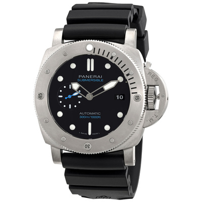 Pre-owned Panerai Submersible watch with automatic movement, black dial, titanium case and rubber strap. Features a unidirectional bezel, date function at the 3 o'clock position, small second subdial, P.9010 calibre mechanism, sapphire crystal, screw-down crown, water resistance to 300 meters.