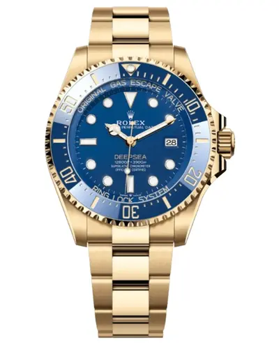 Rolex Sea-Dweller DEEPSEA automatic watch with blue dial, model M136668LB-0001. Features an 18K yellow gold case and bracelet finished with both brushed and polished surfaces; equipped with an Oysterclasp closure. The bezel is a ceramic insert coated in gold tone numerals that rotates unidirectionally. Blue dial displays luminous yellow gold tone hands and markers: circle/stick hour markers plus minute markers around the outer rim, date window at 3 o'clock. Movement is Swiss automatic Calibre 3235 chronometer with 70 hours power reserve; includes screw-down crown and scratch resistant sapphire crystal glass. Functions include displaying a Date and Power Reserve. Case size is 44mm featuring a unique shape. Rated for water resistance up to 12800 feet or 3900 meters depth, backed by a 5-year WatchMaxx warranty.