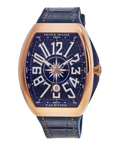 a Franck Muller Vanguard Yachting watch case in Rose Gold tone features a fixed bezel and is equipped with Screw Down crown Automatic Self Winding movement The dial has Arabic numeral hour markers and minute markers around its outer rim on a Blue background Rose Gold tone hands Date function Hour Minute Second display Water resistant at 30 Meters (100 Feet) includes a Solid case back and comes with a Blue Rubber strap fitted with a Tang clasp overall Tonneau shaped case