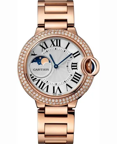 An authentic and brand new Cartier Ballon Bleu de Cartier watch, model number WJBB0025. This timepiece features an elegant 18kt rose gold case paired with an 18kt rose gold bracelet equipped with a hidden deployment clasp. The fixed bezel is meticulously set with diamonds. The silver dial displays blue Roman numerals for the hours and black markers for the minutes around its inner rim, complemented by a moon-phase sub-dial. Powered by an automatic movement, it functions as a moon phase watch and accurately tells the hour and minute. A fluted sapphire cabochon crown sits above the scratch-resistant sapphire crystal glass. The round case measures 37mm in diameter with a thickness of 13.17mm. It includes a solid case back and is rated water resistant to 30 meters or approximately 100 feet. Backed by a 2-year WatchMaxx warranty.
