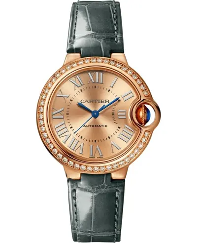 Brand new authentic women's Cartier watch model WJBB0076, 18K rose gold case. Grey alligator leather strap with an 18K rose gold tang clasp. Fixed bezel set with 47 brilliant-cut diamonds totaling 0.68 carats. Rose gold dial features blue hands and Roman numeral hour markers with minute markers on its inner rim. Automatic movement providing hours, minutes, seconds functionality. Fluted case with a sapphire cabochon crown. Scratch-resistant sapphire crystal. Round case measures 33mm in diameter and has a thickness of 9.96mm. Water resistant to 30 meters (100 feet). Includes a 2-year WatchMaxx warranty.