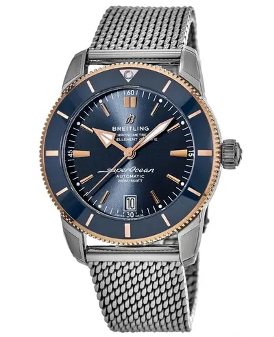 Brand New Authentic Breitling Superocean Heritage 42. Rose gold and steel case with blue dial featuring rose gold tone hands and silver indices with minute markers around the outer rim. Stainless steel bracelet equipped with a deployment clasp. Automatic movement powered by Caliber B20 engine with 70 hours power reserve. Includes screw down crown, scratch resistant sapphire crystal, round shape measuring 42mm in diameter and 14.35mm thick. Solid case back for added protection. Water resistant to 200 meters (660 feet). Comes with a 5 year WatchMaxx warranty.