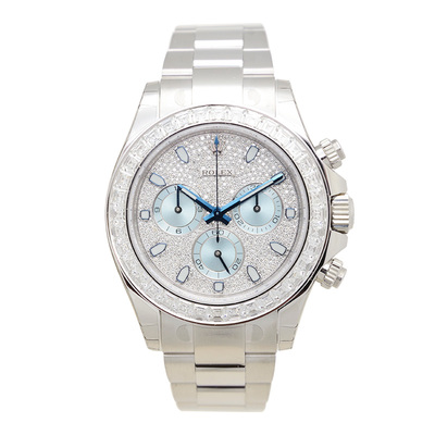 A luxury Rolex Cosmograph Daytona watch designated as model 116576TBR. Features a 40mm round case and bracelet crafted from 950 platinum, set with a diamond pave dial containing 36 baguette-cut diamonds. Includes blue-toned hour and minute hands along with index markers on the outer bezel ring which also displays 36 baguette-cut diamonds; minute markers are present around the outer rim of this bezel insert. Equipped with luminous applications for enhanced readability in low light conditions. The chronograph complication features three sub-dials (for seconds, minutes, hours) and an automatic movement. Secured by a screw-down crown and protected by a scratch-resistant sapphire crystal lens. Comes complete with a solid case back. Water resistant to 100 meters / 330 feet depth. Folding Oysterlock clasp ensures secure fastening. This analog men's luxury timepiece is Swiss Made.
