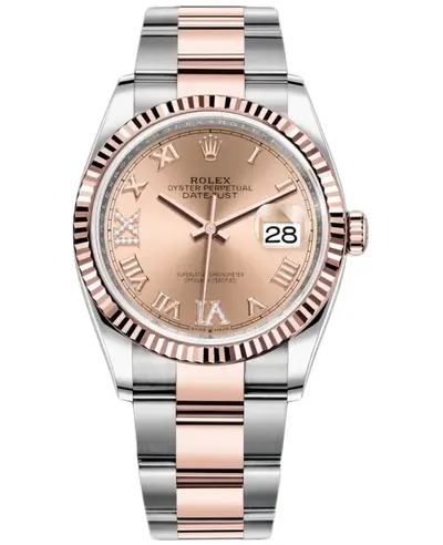 An authentic Rolex Datejust 36mm watch model M126231-0028. Features a ladies' luxury timepiece with an 18kt Rose Gold and Stainless Steel case, matching bracelet, Oysterclasp closure, fixed fluted bezel, Roman numeral hour markers on a Rose dial, Luminescent Rose Gold hands, Diamond pave VI and IX index markers, date displayed at the 3 o'clock position, automatic Chronometer movement powered by Calibre 3235 with 70 hours power reserve, includes Hour Minute Second Date functions, screw-in crown, scratch resistant Sapphire crystal. Water resistant up to 100 meters (approximately 330 feet). Comes with a 2-year WatchMaxx warranty.