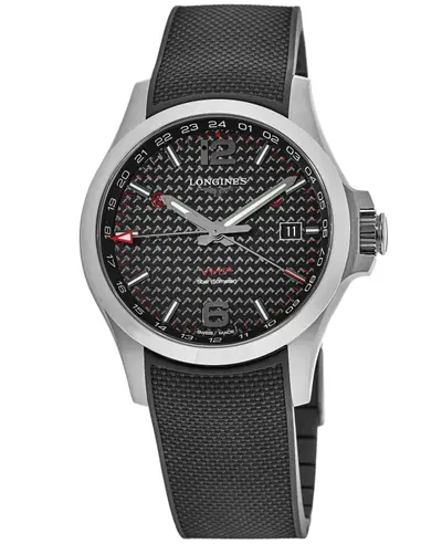 A brand new authentic Longines Conquest V.H.P. GMT men's watch with model number L3.728.4.66.9 (also known as L37284669). The case is made of brushed and polished stainless steel, finished with a smooth bezel, and features a black carbon dial equipped with luminous silver tone hands and hour markers including Arabic numerals, sticks, and minute markers around the outer rim; also includes a central GMT hand. The strap is crafted from rubber. Powered by a Swiss quartz movement featuring Very High Precision (V.H.P.) engine technology and GMT function. Includes date display at 3 o'clock, battery end of life indicator, push-pull crown, sapphire crystal with scratch resistance, round case shape measuring 43mm in size, solid case back, and is rated water resistant to 50 meters / 165 feet.