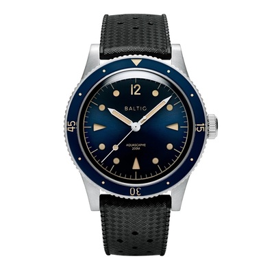 Silver-tone stainless steel case with black leather strap, featuring a blue dial accented by silver-tone hands, Arabic numeral hour markers, and index markers. Includes minute markers on the outer bezel which is made of unidirectional rotating blue stainless steel. Equipped with a Miyota Caliber 9039 automatic movement ensuring accurate timekeeping. Protected by a scratch-resistant sapphire crystal lens. Secured round screw-down caseback measuring 39 mm in diameter and rated at 200 meters / 660 feet water resistance.