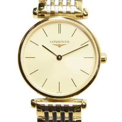 Yellow gold PVD stainless steel case with a two-tone (silver-tone and yellow gold PVD) stainless steel bracelet. Fixed yellow gold PVD bezel. Champagne dial with black hands and index hour markers. Dial Type: Analog. Longines calibre L209 quartz movement. Scratch resistant sapphire crystal. Pull / push crown. Solid case back. Round case shape. Case size: 24.5 mm. Case thickness: 5 mm. Fold over clasp. Water resistant at 30 meters / 100 feet. Functions: hour, minute. La Grande Classique Series. Luxury watch style. Watch label: Swiss Made. Item Variations: L4 209 2 32 7, L4-209-2-32-7, L4/209/2/32/7, L42092327. Longines La Grande Classique Quartz Champagne Dial Ladies Watch L4.209.2.32.7.
