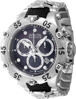 Silver-tone stainless steel case with a two-tone (black and silver-tone) silicone and stainless steel strap. Uni-directional rotating two-tone (silver-tone and black) stainless steel bezel. Black dial with silver-tone hands and index hour markers. Minute markers around the outer rim. Dial Type: Analog. Luminescent hands and markers. Date display between 4 and 5 o'clock position. Three sub-dials displaying: day, 60 second and 30 minute. Ronda Caliber Z60 quartz movement. Scratch resistant Flame Fusion crystal. Screw down crown. Solid case back. Round case shape, case size: 54.00 mm, case thickness: 20.20 mm. Band width: 32 mm, band length: 8.25 inches. Fold over safety clasp. Water resistant at 200 meters / 660 feet. Functions: chronograph, date, day, hour, minute, small second. Reserve Series. Sport watch style. Watch label: Swiss Movt. Invicta Reserve Venom Cobra Chronograph Quartz Black Dial Mens Watch 47157.