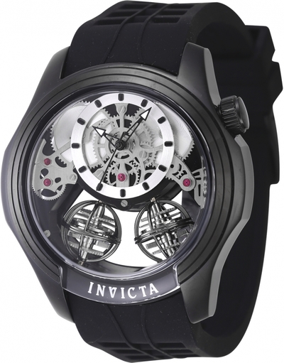 Black stainless steel case with a black silicone strap. Fixed black stainless steel bezel. Black dial with black hands and index hour markers. Dial Type: Analog. Luminescent hands. Hattori Caliber PC21AF quartz movement. Scratch resistant mineral crystal. Pull / push crown. Solid case back. Round case shape, case size: 46 mm, case thickness: 18.00 mm. Band width: 23 mm, band length: 8.50 inches. Buckle clasp. Water resistant at 30 meters / 100 feet. Functions: hour, minute, second. Specialty Series. Casual watch style. Watch label: Japan Movt. Invicta Specialty Quartz Black Dial Mens Watch 47374.