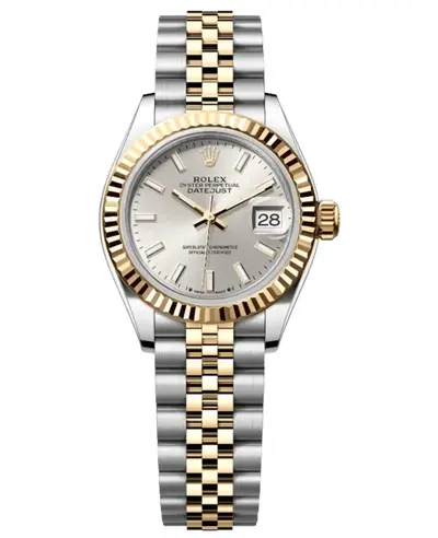 Brand New Authentic Rolex Lady-Datejust 28 Stainless Steel and Yellow Gold Automatic Silver Dial Jubilee Bracelet Women's Luxury Watch Model M279173-0019. Brushed and Polished Oystersteel case with Brushed and Polished 18K Yellow Gold and Oystersteel Bracelet watch band. Brushed and Polished Stainless Steel Crownclasp clasp. Fixed. Fluted. 18K Yellow Gold bezel. Dial description: Luminous Yellow Gold Tone Hands and Stick Hour Markers with Minute Markers Around the Outer Rim and the Date at 3 o'clock on a Silver dial. Swiss Automatic. Chronometer movement. Chronograph sub-dials display: Date. Calendar: Date at 3 o'clock. Powered by Rolex Calibre 2236 engine with 55 hours power reserve. Watch functions: Date, Power Reserve, Hour, Minute, Second. Screw Down crown. Scratch Resistant Sapphire crystal. Round case shape. Case size: 28mm. Solid case back. 100 Meters - 330 Feet water resistant. 5-year WatchMaxx warranty. Also known as model: M2791730019.