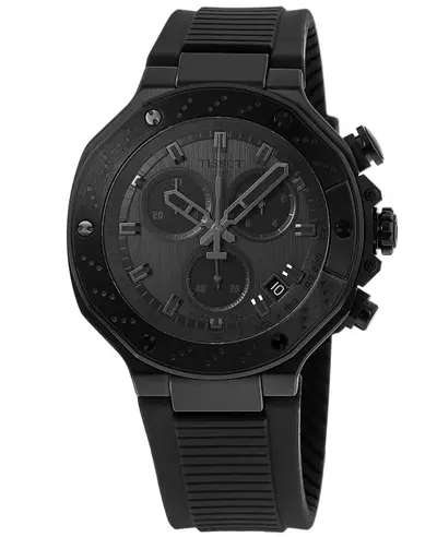 Authentic men's watch with grey dial and silicone strap. Features automatic chronograph movement, PVD coated stainless steel case and bracelet including a polished tang clasp, fixed bezel, luminous hands, stick hour markers and minute markers, tachymeter scale outer rim, date display between 4-5 o'clock, three sub-dials (30 minutes, seconds, tenths of second), scratch resistant sapphire crystal. Powered by Swiss quartz Caliber 13 engine with battery indicator.