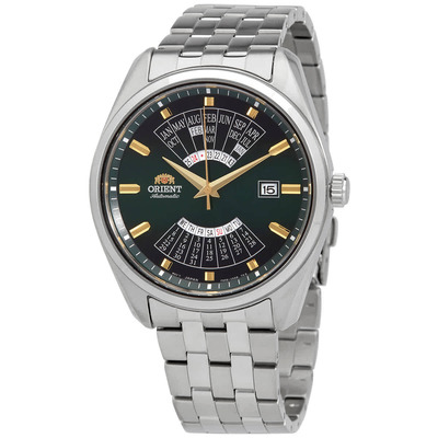 Solid stainless steel case with fixed bezel and matching stainless steel bracelet. Features a green dial accented by yellow gold-tone hands and index hour markers, along with minute markers on the outer rim. Equipped with an analog perpetual calendar displaying month, date, day functions. Powered by an automatic movement with 40-hour power reserve. Secured with a mineral crystal that offers scratch resistance and features a transparent case back. Includes a deployment clasp for easy adjustment and secure fastening. Water resistant up to 50 meters (165 feet).