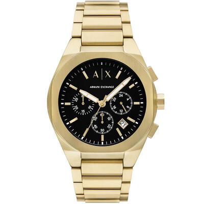A sporty quartz chronograph watch with a black dial, featuring gold-tone hands and index hour markers. Includes three sub-dials for seconds, minutes, and hours functions. Equipped with date display at the 4-5 position. Gold-tone stainless steel case and bracelet assembly. Fixed bezel in a similar finish to the case. Scratch resistant mineral crystal lens. Pull/push button chronograph movement activated by a crown or pushers. Solid case back closure. Round case measuring 42 mm in diameter. Band width of 16 mm accommodates the fold-over clasp with safety release mechanism. Water resistance up to 50 meters (approximately 165 feet). Analog functions display all hours, minutes and seconds clearly.