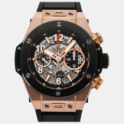 A men's automatic skeleton watch from Hublot featuring rose gold case, Big Bang Unico collection, measuring 45 mm in diameter with reference code 1071569.