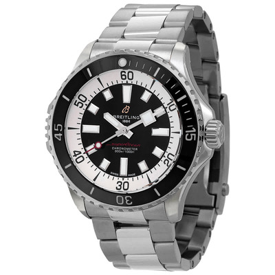 Silver-tone stainless steel case and bracelet. Bi-directional rotating black stainless steel bezel. Black dial with silver-tone hands, index hour markers, minute markers around the outer rim. Analog dial type featuring luminescent accents on hands and markers. Powered by Breitling Calibre 17 automatic movement (based on ETA 2824-2), includes 25 jewels, beats at 28800 vph, approx. 42-hour power reserve. Scratch-resistant sapphire crystal. Screw-down crown. Round case measuring 46 mm in diameter. Equipped with a fold-over clasp secured by a safety release mechanism. Water resistant to 300 meters / 1000 feet depth. Functions include hour, minute, and second hands, plus chronometer capabilities. Superocean dive watch series, Swiss Made label. Includes original box, international warranty card, manual (complete accessories).