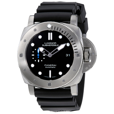 Grey titanium case with a black rubber strap. Fixed grey titanium bezel. Black dial with luminous silver-tone hands and dot hour markers. Minute markers around the outer rim. Dial Type: Analog. Luminescent hands and markers. Date display at the 3 o'clock position. One subdial displaying: small second. Panerai Calibre P.9010 Automatic movement, containing 31 Jewels, composed of 200 parts, bitting at 28800 vph, and has a power reserve of approximately 72 hours. Scratch resistant sapphire crystal. Screw down crown. Solid case back. Cushion case shape, case size: 47 mm. Band width: 22 mm. Tang clasp. Water resistant at 300 meters / 1000 feet. Functions: date, hour, minute, second. Luminor Submersible 1950 Series. Luxury watch style. Watch label: Swiss Made. Pre-owned Panerai Luminor Submersible 1950 Automatic Black Dial Mens Watch PAM01305.