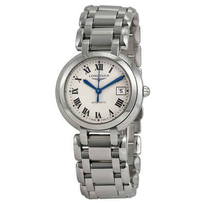 Ladies Automatic Analog Watch with Date Display at 3 O'Clock Position, Silver Dial Featuring Blue Sword-Shape Hands and Roman Numeral Hour Markers. Includes Minute Markers Around the Outer Rim and a Fixed Stainless Steel Bezel on a Stainless Steel Case with Round Shape (Size: 30mm). Equipped with Longines Calibre L595/592 Automatic Movement Based Upon ETA 2000-1, Containing 20 Jewels. Operates at 28800 Vph Frequency and Has Approx. 40 Hours Power Reserve. Features Sapphire Crystal for Scratch Resistance, Pull/Push Crown, Solid Case Back, Stainless Steel Bracelet with Width of 18mm Secured by Fold-Over Clasp with Push Button Release. Water Resistant to 30 Meters / 100 Feet.