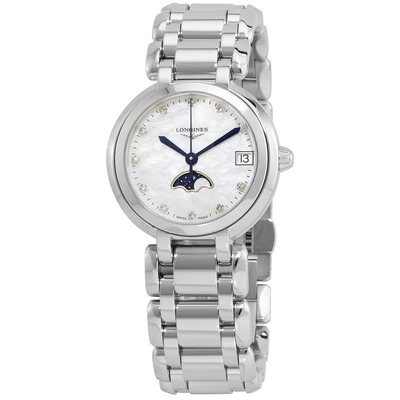 Quartz analog watch with moon phase and date display features, Longines calibre L296 movement, stainless steel case and bracelet including fixed bezel, white mother of pearl dial accented by blue sword-shaped hands and hour markers, sapphire crystal resistant to scratches, pull/push crown adjustment, solid caseback, round 30.5mm case size with butterfly clasp closure mechanism, water resistance up to 100 feet or 30 meters, powered by quartz movement, includes original box, manual and complete accessories.