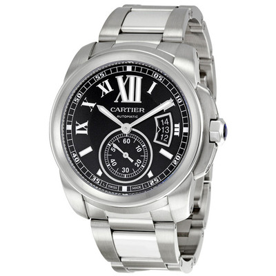 Silver-tone stainless steel case and bracelet. Fixed stainless steel bezel. Black dial with luminous silver-tone hands and Roman numeral, index hour markers, minute markers around the outer rim. Analog dial type features luminescent hands and markers. Date display at 3 o'clock position. Small second subdial visible at 6 o'clock. Powered by Cartier Calibre 1904-PS MC Automatic movement with 27 jewels, operating frequency of 28800 vph (4Hz), offering approximately 48 hours power reserve. Scratch-resistant sapphire crystal. Faceted blue synthetic spinel crown in an octagonal shape. Skeleton case back showing the movement. Round case shape measuring 42 mm diameter and 10 mm thickness. Band width is 24 mm utilizing a deployment clasp. Water resistant up to 30 meters / 100 feet depth. Functions include date, hour, minute, small second display. Calibre De Cartier Series watch, Swiss Made dress style.
