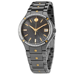 Mid grey PVD stainless steel case and bracelet. Fixed mid grey PVD bezel set with diamonds. Grey mother of pearl dial with luminous gold-tone hands and index hour markers. Minute markers around the outer rim. The Movado dot appears at the 12 o'clock position. Dial Type: Analog. Luminescent hands and markers. Date display at the 3 o'clock position. Quartz movement. Scratch resistant sapphire crystal. Pull / push crown. Solid case back. Round case shape. Case size: 32 mm. Deployment clasp. Water resistant at 50 meters / 165 feet. Functions: date, hour, minute, second. Additional Info: note: mother-of-pearl dials may vary in color as each piece is unique making every watch one of a kind. 52 diamonds =0.203 cttw si clarity. Se Series. Dress watch style. Watch label: Swiss Made. Movado SE Quartz Diamond Ladies Watch 0607542.