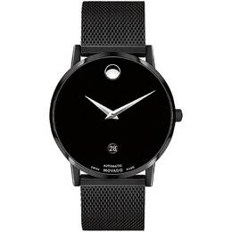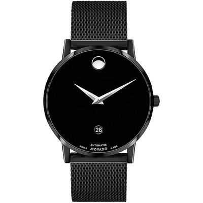 Black PVD stainless steel case with a black PVD stainless steel mesh bracelet. Fixed black PVD bezel. Black dial with silver-tone hands. No markers. The Movado dot appears at the 12 o'clock position. Dial Type: Analog. Date display above the 6 o'clock position. Automatic movement. Scratch resistant sapphire crystal. Pull / push crown. Transparent case back. Round case shape. Case size: 40 mm. Band width: 21 mm. Deployment clasp. Water resistant at 30 meters / 100 feet. Functions: date, hour, minute, second. Museum Classic Automatic Series. Casual watch style. Watch label: Swiss Made. Movado Museum Classic Automatic Black Dial Mens Watch 0607568.