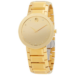 Yellow gold PVD stainless steel case and bracelet. Fixed yellow gold PVD bezel. Champagne dial with yellow gold-tone hands and diamond hour markers. The Movado dot appears at the 12 o'clock positions. Dial Type: Analog. Quartz movement. Scratch resistant sapphire crystal. Pull / push crown. Solid case back. Round case shape. Case size: 43 mm. Fold over clasp. Water resistant at 30 meters / 100 feet. Functions: hour, minute. Casual watch style. Watch label: Swiss Made. Movado Quartz Diamond Champagne Dial Watch 0607588.