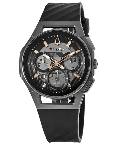 Authentic Bulova Curv Chronograph Men's Sports Watch Model 9. Features a dark grey dial, rose gold tone luminous hands and index hour markers with minute graduation around the outer rim. Equipped with three sub-dials displaying tenths of a second, seconds, and minutes respectively alongside date functionality. Powered by quartz movement. Comes in titanium case paired with a black rubber strap featuring tang clasp and screw-down crown. Secured by scratch-resistant sapphire crystal lens. Fixed bezel design. 30 meter water resistance (100 feet) ensures durability against splashes. Includes a 2 year WatchMaxx warranty.