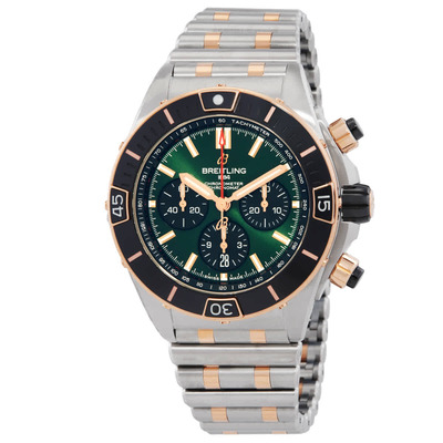 Two-tone (silver-tone and rose gold-tone) stainless steel & 18kt rose gold case with bracelet; Uni-directional rotating rose gold-tone bezel insert featuring black inlaid ring made from 18k rose gold and ceramic; Green dial accented by rose gold-tone hands and index hour markers; Minute markers around the outer rim; Luminescent coating on hands and markers for low-light visibility; Date display at the 6 o'clock position; Chronograph function equipped with three sub-dials (seconds, minutes/30 seconds, tenths of a second); Breitling Calibre B01 automatic movement offering 70-hour power reserve; Scratch-resistant sapphire crystal front cover; Screw-down winding/crown protection; Transparent sapphire case back allowing visibility of the movement; Round case measuring 44 mm in diameter and 14.4 mm thick; Fold over clasp with safety release mechanism; Water resistant to 200 meters / 660 feet (suitable for swimming/snorkeling); Functions include analog display, chronograph timing, date indication, hour/minute/second readouts; Belongs to the Super Chronomat B01 Series; Sport watch design; Swiss Made label on the dial.