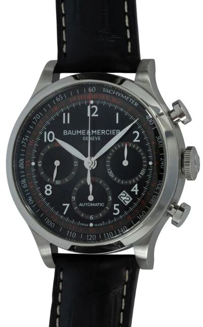 Silver-tone stainless steel case, black leather strap. Fixed silver-tone bezel. Black dial with silver-tone hands and Arabic numeral hour markers featuring minute outer track. Analog display. Date window between 4-5 o'clock. Chronograph function with three sub-dials (60 second, 30 minute, 12 hour). Automatic movement based on ETA 7750 Caliber 7753 containing 27 jewels and running at 28800 vph. Approximate 44-hour power reserve. Scratch-resistant sapphire crystal. Transparent case back. Round shape measuring 42 mm in diameter. Fold-over clasp with safety lock. Water resistant to 50 meters / 165 feet. Hour, minute, second and date functions. Dress watch style. Swiss Made.