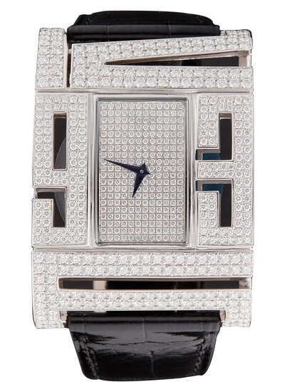 Ladies quartz analog watch, Swiss movement. White gold case (18kt), black leather strap, buckle clasp. Fixed bezel set in white gold with diamonds, pave diamond dial face accented by blue hands.