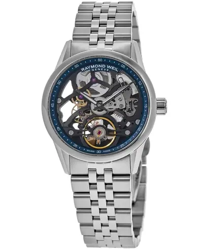 New authentic automatic Raymond Weil men's steel skeleton dial watch model 2783-st-50000 or 2783ST50000. Features a brushed and polished stainless steel case, solid stainless steel bracelet with folding clasp, sapphire crystal scratch-resistant display back, luminous silver tone hands and stick/arabic numeral markers visible through the skeleton dial which features an exposed balance wheel, powered by Raymond Weil Calibre RW1212 automatic movement offering 41 hours power reserve, smooth bezel, round case shape measuring 38mm diameter with a thickness of approximately 10.80mm, water resistant up to 100 meters (approx 330 feet), includes screw down crown and comes with a standard 2-year WatchMaxx warranty.