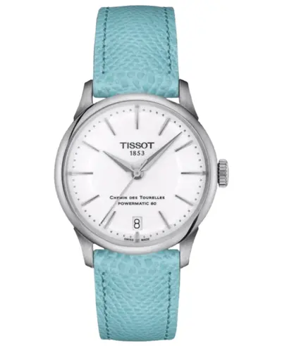Authentic Tissot Chemin des Tourelles automatic watch with white dial and light blue leather strap. Features a brushed/polished stainless steel case, polished stainless steel deployment buckle, sapphire crystal glass resistant to scratches, round shape measuring 34mm in diameter and 10.47mm thick. Powered by the reliable Powermatic 80 movement offering an 80-hour power reserve. Includes date function at the 6 o'clock position indicated by stick hour markers with minute markers on the outer bezel rim and polished silver-tone hands. Comes with a see-through caseback, standard water resistance of 50 meters (165 feet), and is covered by a 2-year WatchMaxx warranty.