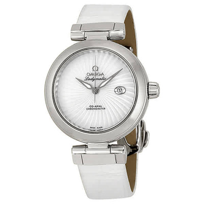 Automatic movement with 50 hour power reserve. Analog dial featuring white mother of pearl supernova design and silver-tone luminous painted hands. Date window at the 3 o'clock position. Fixed stainless steel bezel. Scratch resistant sapphire crystal. Skeleton case back. Deployment buckle clasp with push button activation. White alligator leather strap included. Case diameter is 34 mm. Round case shape. Water resistant to 100 meters / 330 feet depth. Includes hour, minute, second and date functions. Luxury ladies watch style. Swiss made.