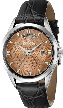 Silver-tone stainless steel case with a black leather strap. Fixed silver-tone stainless steel bezel. Light brown dial with silver-tone hands and index-Roman numeral hour markers. Minute markers around the outer rim. Dial Type: Analog. Luminescent hands and markers. Date display at the 3 o'clock position. Hattori Caliber VJ55 quartz movement. Scratch resistant Flame Fusion crystal. Pull / push crown. Solid case back. Round case shape, case size: 40 mm, case thickness: 11 mm. Band width: 20 mm, band length: 7.75 inches. Buckle clasp. Water resistant at 50 meters / 165 feet. Functions: date, day, hour, minute, second. Vintage Series. Casual watch style. Watch label: Japan Movt. Invicta Vintage Date Day Quartz Light Brown Dial Ladies Watch 44261.