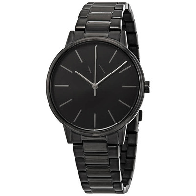 Black PVD stainless steel case and bracelet, fixed black PVD bezel, black dial with black hands and index hour markers, Armani Exchange logo at 12 o'clock, analog quartz movement, scratch resistant mineral crystal, solid case back, round case shape, case size 42mm, case thickness 8mm, band width 20mm, deployment clasp, water resistant to 50 meters / 165 feet, hour, minute, second functions, casual style.