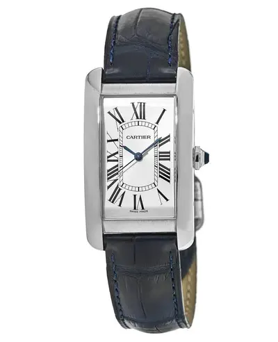 A new genuine Cartier Tank Americaine model WSTA0018. Features a stainless steel case paired with a luxury blue leather alligator strap and deployment clasp. Includes fixed bezel. The dial displays Roman numeral hour markers against a silvered background and features blue steel sword-shaped hands for the hours, minutes, and seconds along with a central second hand. Powered by an automatic movement providing precise timekeeping functions including hour, minute, and second display via analog subdials or indicators (confirmed as analog hands). Equipped with a scratch-resistant sapphire crystal lens protecting the front of the watch. Case dimensions are 45.1mm x 26.6mm in width by height, approximately X inches, with case thickness measuring 9.65mm. Comes ready to wear and includes solid case back construction. Water resistance up to 30 meters (or roughly 100 feet). Includes a two-year WatchMaxx warranty.
