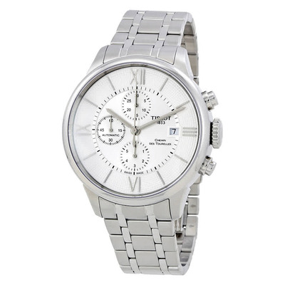 Men's automatic chronograph watch from Tissot, model Chemin Des Tourelles featuring a stainless steel case and bracelet with fixed bezel. Silver analog dial includes silver-tone alpha-style hands and index hour markers, Roman numerals at the 3/6/9/12 o'clock positions and minute markers on an inner ring. Date display located at the 3 o'clock position. Chronograph functions: three sub-dials for seconds (60), minutes (30) and hours (6). Powered by ETA C01.211 automatic movement based upon Lemania 5100, boasting 15 jewels and a frequency of 28800 vph. Approximate power reserve is 45 hours. Equipped with scratch-resistant sapphire crystal glass. Pull/push crown operation. Transparent skeleton case back showing the movement. Classic round case shape measures 44mm in diameter and 14mm thick. Band width: 21 mm, length: 8 inches (approx.). Secured by a butterfly clasp. Water resistant up to 50 meters / 165 feet.